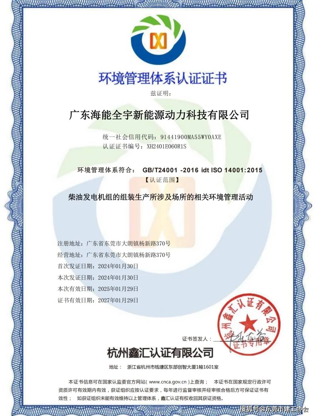 环境管理体系认证证书