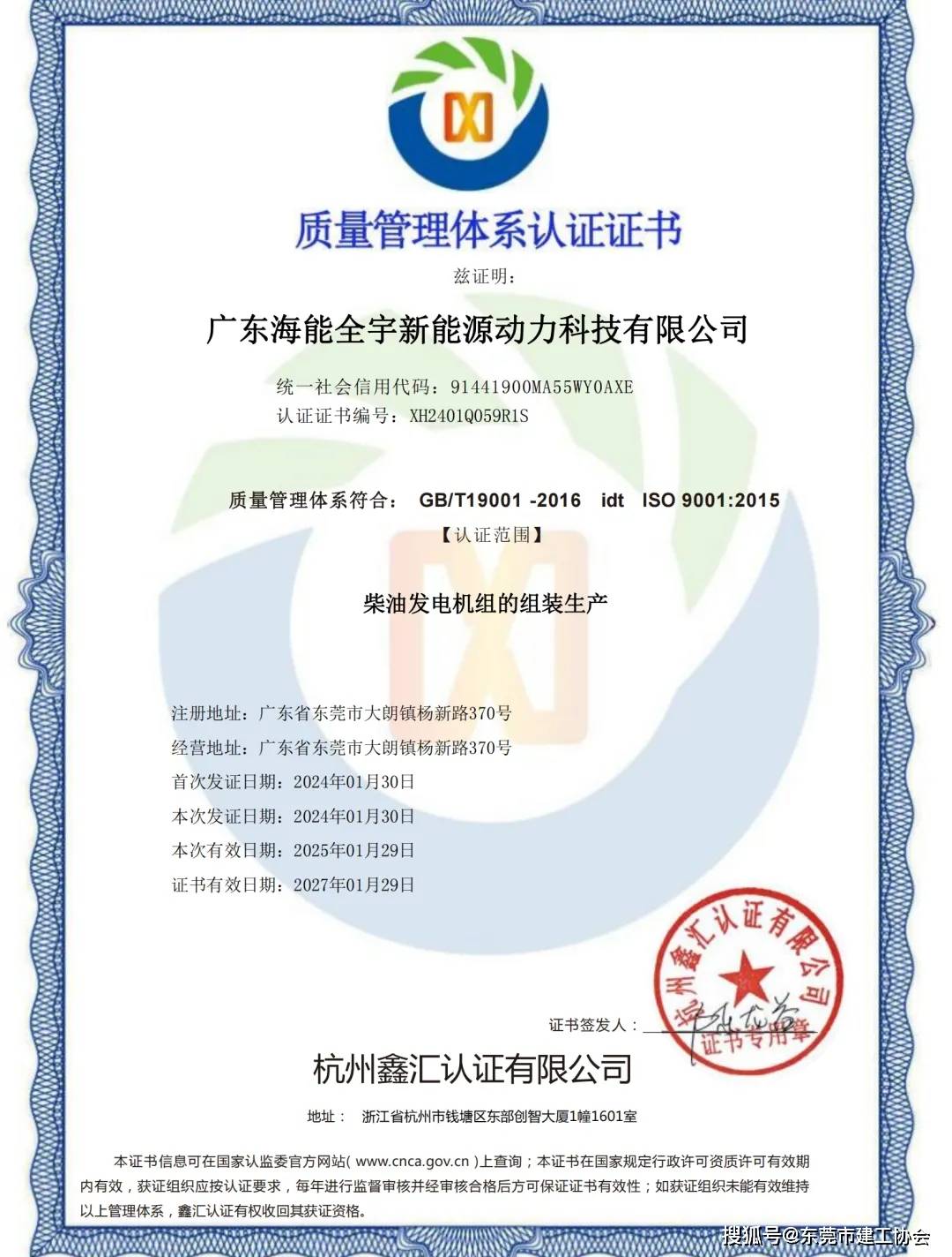 质量管理体系认证证书
