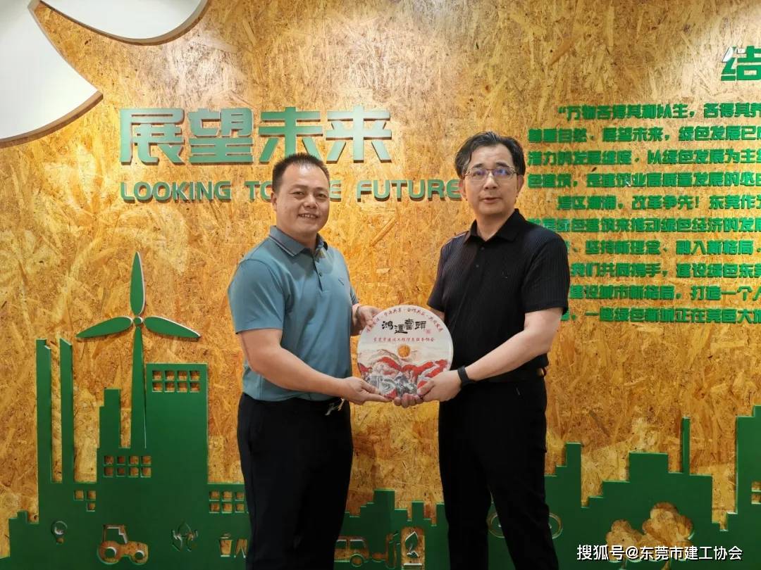 我会会长刘建伟与东莞市绿色建筑协会会长邓建军互赠协会纪念礼品,并祝愿两会友谊绵长,会务昌盛。