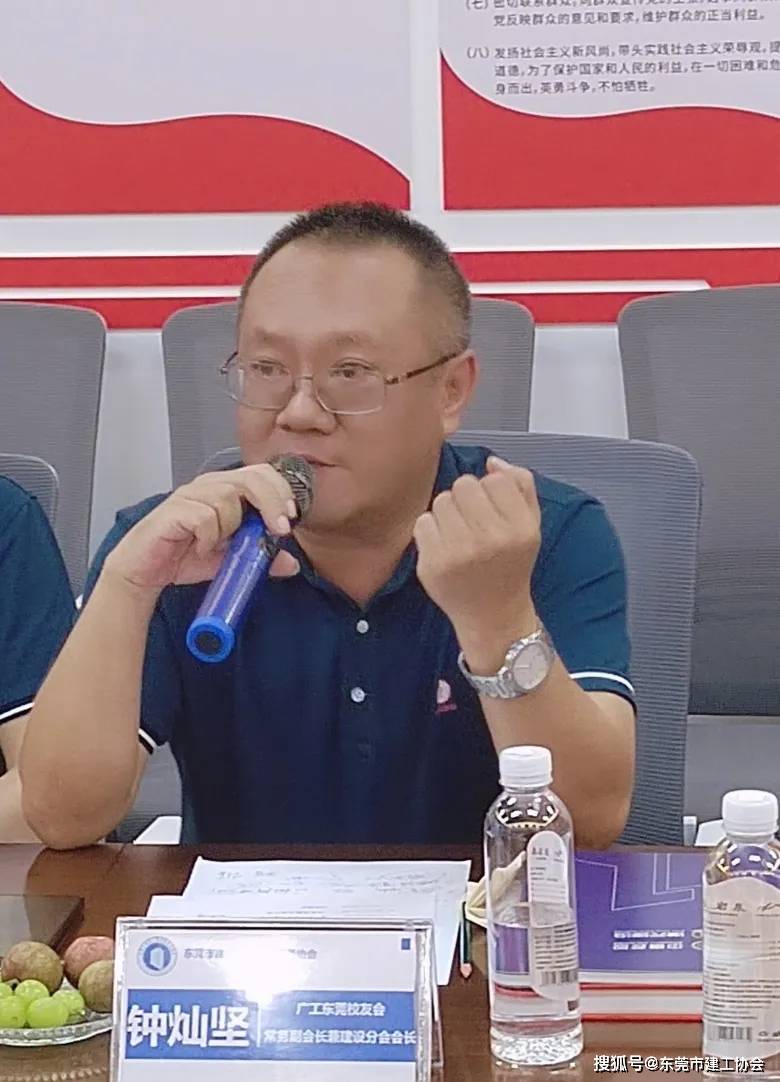 会上,广工东莞校友会常务副会长、建设分会会长钟灿坚简单介绍了校友会的发展历程,广工东莞校友会于2018年10月13日成立,并在同一天成立了建设行业分会,聚集了整个建筑业上下游产业链的校友。广工东莞校友会经过发展,逐步成立了金融分会、建设分会、 环保分会、化工分会、制造分会五个行业分会。钟会长表示非常高兴能够来到我会,内心倍感亲切与温馨,并希望两会之间能够产生紧密的联结,携手合作,实现共赢。还特别邀请我会组团到广工东莞校友会进行深度交流,促进合作发展。